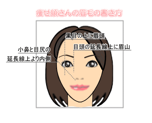 “痩せ顔”さんの眉毛の書き方をご紹介します。眉頭は、基本と同じように、目頭の延長線上になります。眉山は黒目の上になるようにして下さい。眉尻は、小鼻と目尻の延...